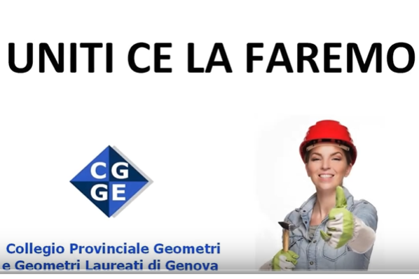 Parole che vogliono incoraggiare, parole per raccontare il proprio momento professionale, parole per esprimere la determinazione a ripartire, parole per sottolineare una possibilità che accomuna tutti, parole che ripetono continuamente di non mollare. Sono i messaggi formulati in un video dagli iscritti del Collegio Provinciale dei Geometri e Geometri Laureati di Genova, che all’unisono vogliono arrivare dritto al cuore dei colleghi. Il titolo è: #UNITI ce la faremo