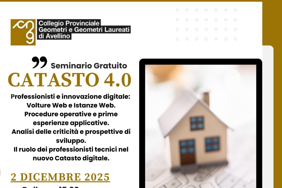 Prosegue la programmazione di iniziative istituzionali sui territori, finalizzate a sostenere un aggiornamento professionale continuo e coerente con l’evoluzione normativa e digitale del settore. In questo quadro, il Collegio Provinciale Geometri e Geometri Laureati di Avellino organizza il seminario gratuito “Catasto 4.0”, dedicato a innovazione digitale e operatività: volture web e istanze web, procedure operative, prime esperienze applicative, analisi delle criticità e prospettive di sviluppo, con un focus sul ruolo dei geometri e, più in generale, dei professionisti tecnici nel nuovo catasto digitale.